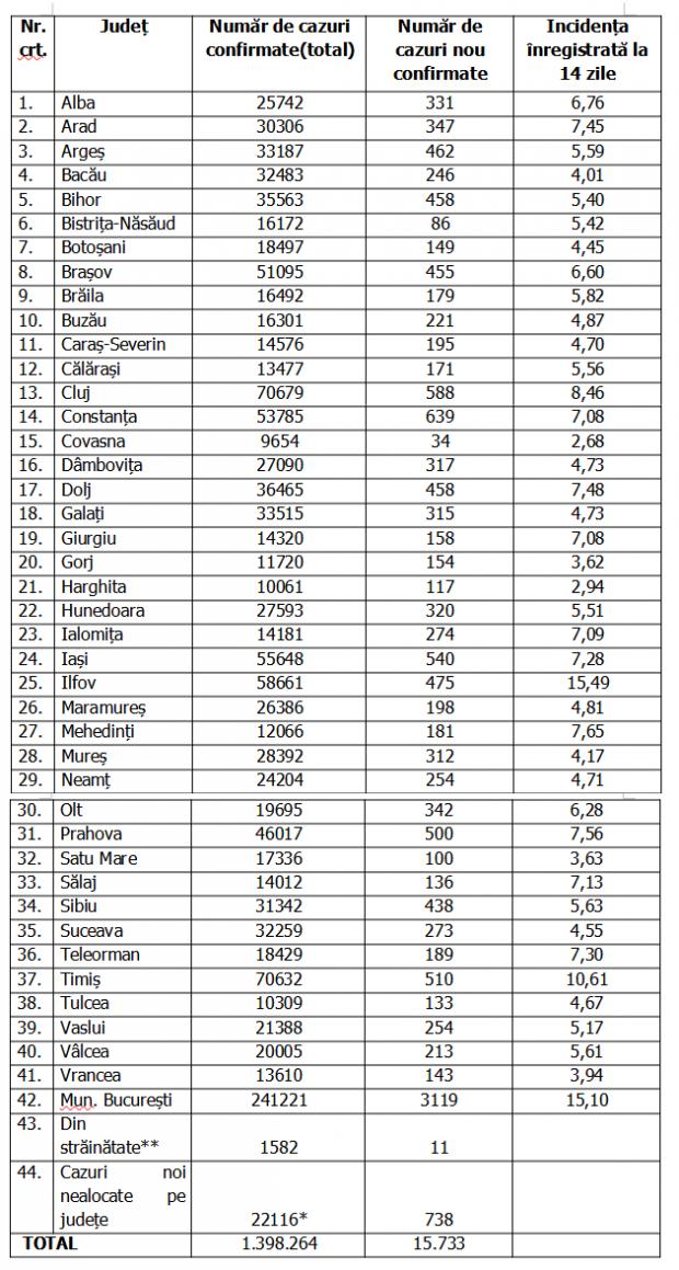 În ultimele 24 de ore au fost înregistrate 15.733 cazuri noi de persoane infectate cu SARS – CoV – 2 (COVID – 19), dintre care 402 sunt ale unor pacienți reinfectați, testați pozitiv la o perioadă mai mare de 180 de zile după prima infectare.