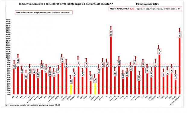 În intervalul 12.10.2021 (10:00) – 13.10.2021 (10:00) au fost raportate de către INSP 390 de decese (190 bărbați și 200 femei), dintre care 8 anterioare intervalului de referință, ale unor pacienți infectați cu noul coronavirus, internați în spitalele din Alba, Arad, Argeș, Bacău, Bihor, Bistrița-Năsăud, Brăila, Botoșani, Brașov, Buzău, Caraș-Severin, Călărași, Cluj, Constanța, Covasna, Dâmbovița, Dolj, Galați, Giurgiu, Gorj, Harghita, Hunedoara, Ialomița, Iași, Ilfov, Maramureș, Mehedinți, Mureș, Neamț, Olt, Prahova, Sălaj, Sibiu, Suceava, Teleorman, Timiș, Tulcea, Vaslui, Vâlcea, Vrancea și Municipiul București.