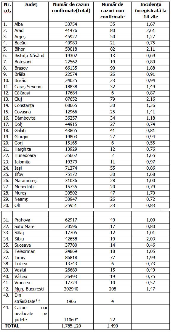 În ultimele 24 de ore au fost înregistrate 1.490 de cazuri noi de persoane infectate cu SARS – CoV – 2 (COVID – 19), dintre care 31 sunt ale unor pacienți reinfectați, testați pozitiv la o perioadă mai mare de 180 de zile după prima infectare.