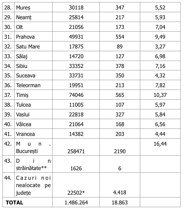 În ultimele 24 de ore au fost înregistrate 18.863 de cazuri noi de persoane infectate cu SARS – CoV – 2 (COVID – 19), dintre care 273 sunt ale unor pacienți reinfectați, testați pozitiv la o perioadă mai mare de 180 de zile după prima infectare.