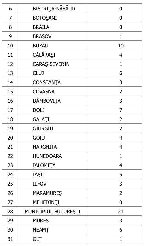 Au fost raportate 8 decese anterioare intervalului de referință, survenite în județele Arad, Bacău, Mureș, Neamț, 6 în luna octombrie 2021 și 2 în luna noiembrie 2021. În intervalul de referință au fost raportate 58 de decese.