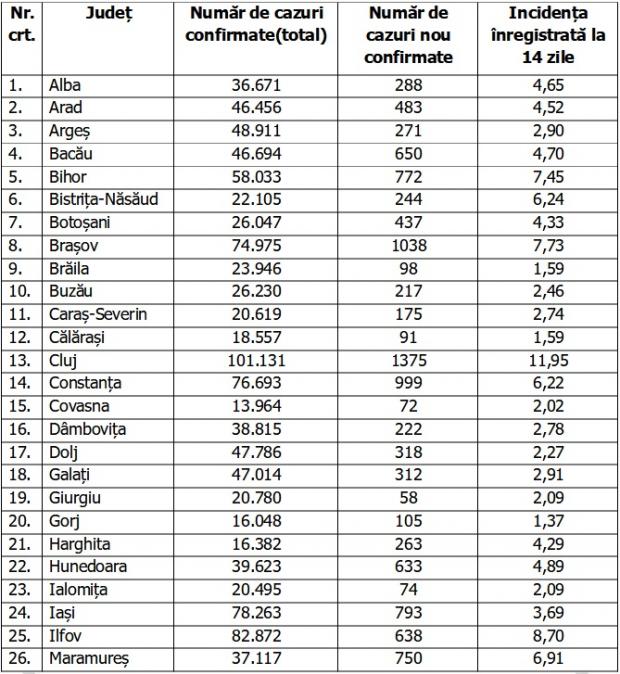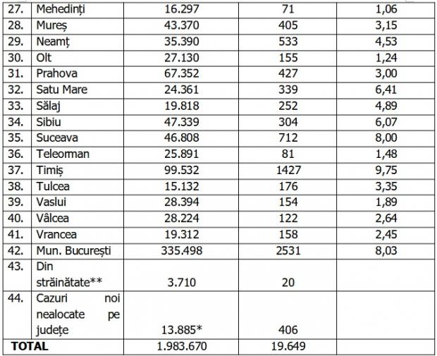 1.812.242 de pacienți au fost declarați vindecați. Distinct de cazurile nou confirmate, în urma retestării pacienților care erau deja pozitivi, 784 de persoane au fost reconfirmate pozitiv.