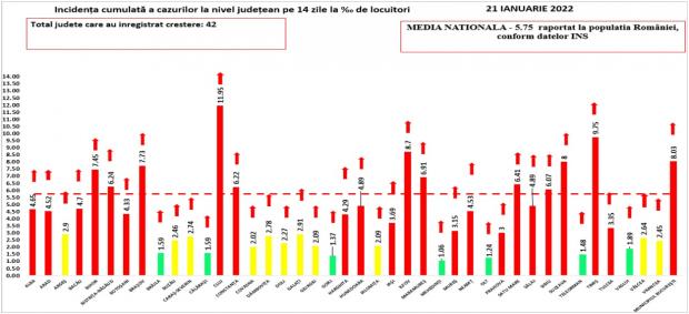 Până astăzi, 59.477 de persoane diagnosticate cu infecție cu SARS – CoV – 2 au decedat. În intervalul 20.01.2022 (10:00) – 21.01.2022 (10:00) au fost raportate de către INSP 49 de decese (21 bărbați și 29 femei), ale unor pacienți infectați cu noul coronavirus, internați în spitalele din Alba, Arad, Bacău, Botoșani, Brașov, Buzău, Caraș-Severin, Cluj, Constanța, Dâmbovița, Dolj, Galați, Giurgiu, Harghita, Iași, Maramureș, Mureș, Olt, Prahova, Sălaj, Sibiu, Suceava, Teleorman, Timiș, Vaslui, Vrancea și Municipiul București.
