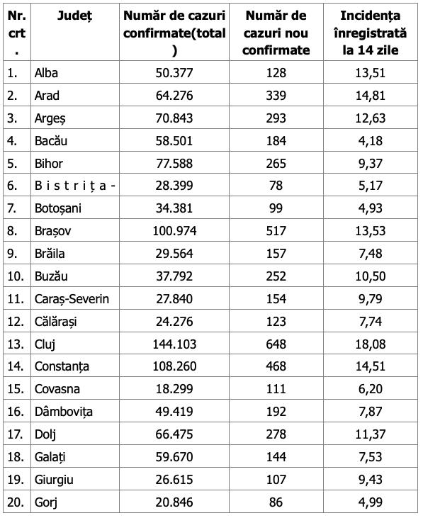 Bilanț COVID-19 din 22 februarie 2022, în România. Distribuția pe județe