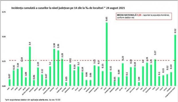 În intervalul 23.08.2021 (10:00) – 24.08.2021 (10:00) au fost raportate de către INSP 14 decese (8 bărbați și şase femei), ale unor pacienți infectați cu noul coronavirus, internați în spitale din județele Alba, Bacău, Cluj, Constanța, Dolj, Gorj, Hunedoara, Iași, Mehedinți, Mureș, Suceava, Timiș, Vrancea.