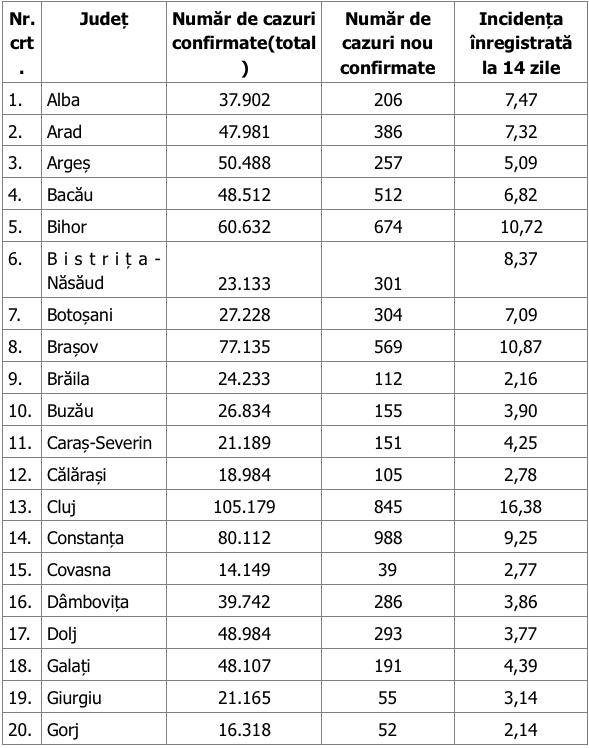 În ultimele 24 de ore au fost înregistrate 19.685 de cazuri noi de persoane infectate cu SARS – CoV – 2 (COVID – 19), cu 7.603 mai mult decât în ziua anterioară. 1.740 dintre cazurile noi din 24 de ore sunt ale unor pacienți reinfectați, testați pozitiv la o perioadă mai mare de 180 de zile după prima infectare.