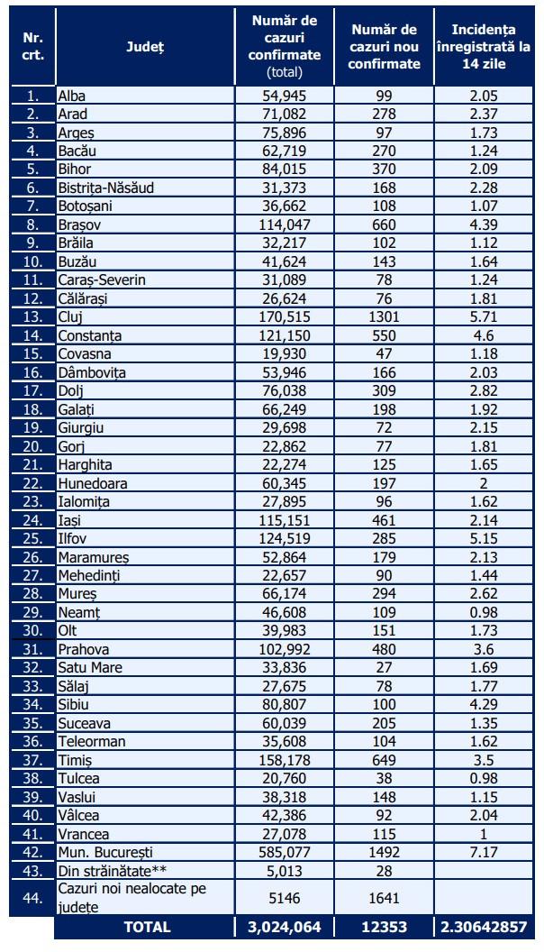 În ultimele 24 de ore au fost înregistrate 12.353 cazuri noi de persoane infectate cu SARS - CoV - 2 (COVID - 19), cu 7.398 mai multe față de ziua anterioară.