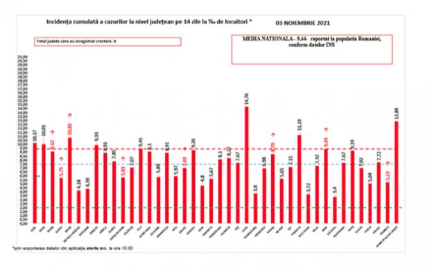 Bilanț COVID-19 din 3 noiembrie 2021, în România. Distribuția pe județe