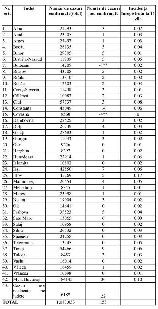 *Referitor la „cazurile noi nealocate pe județe”, facem precizarea că numărul acestora este determinat de modificările aduse platformei electronice prin care sunt raportate și centralizate rezultatele testelor pentru noul coronavirus. Astfel, conform noii metodologii, centrele de testare introduc în mod direct rezultatele testelor realizate, urmând ca de la nivelul Direcțiilor de Sănătate Publică să fie realizată ancheta epidemiologică și atribuite cazurile pozitive județului/localității de care aparțin persoanele infectate.