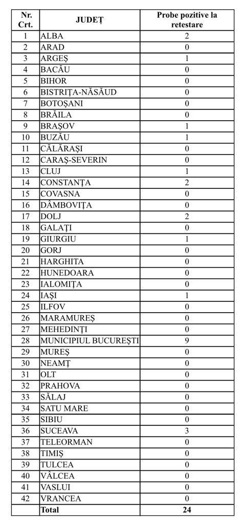 Distinct de cazurile nou confirmate, în urma retestării pacienților care erau deja pozitivi, 24 de persoane au fost reconfirmate pozitiv. Distribuția pe județe a acestor cazuri o regăsiți în tabelul de mai jos.