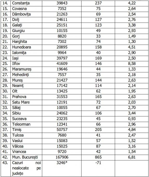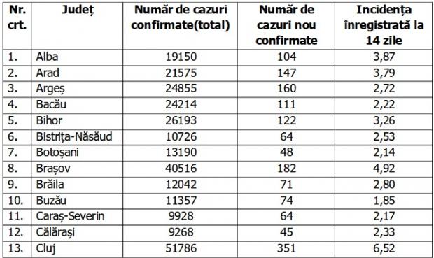 Dintre acestea, 1.495 sunt internate la ATI. Până la această dată, la nivel național, au fost prelucrate 6.907.828 de teste RT-PCR și 683.537 de teste rapide antigenice.