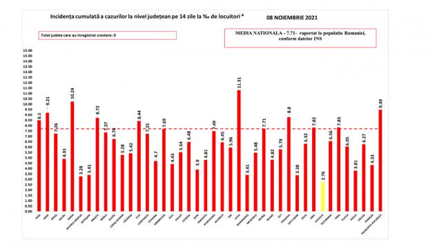 Bilanț COVID-19 din 8 noiembrie 2021, în România. Distribuția pe județe