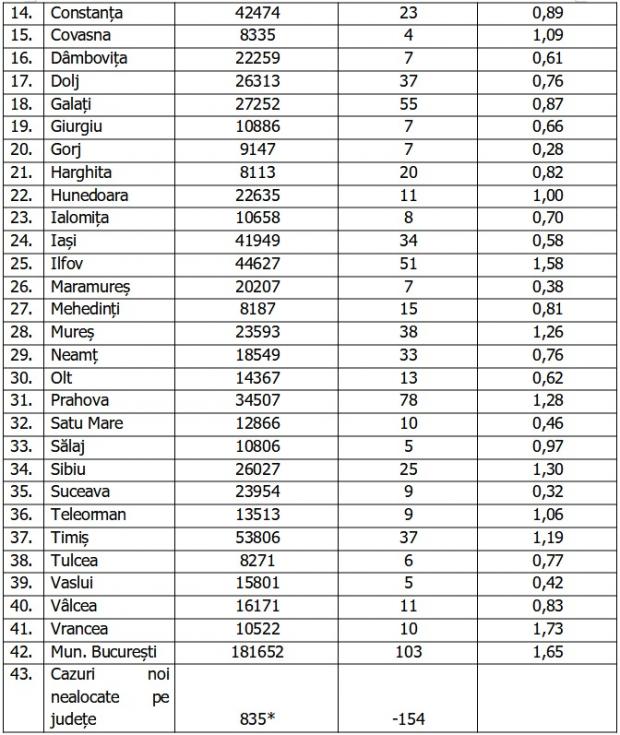 În urma testelor efectuate la nivel național, față de ultima raportare, au fost înregistrate 857 cazuri noi de persoane infectate cu SARS – CoV – 2 (COVID – 19), acestea fiind cazuri care nu au mai avut anterior un test pozitiv.