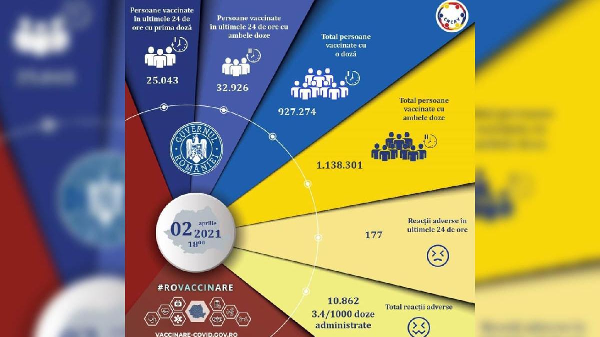 De la începutul campaniei naționale de vaccinare au fost imunizate 2.065.575 de persoane, dintre care 1.138.301 de persoane au primit ambele doze de vaccin.