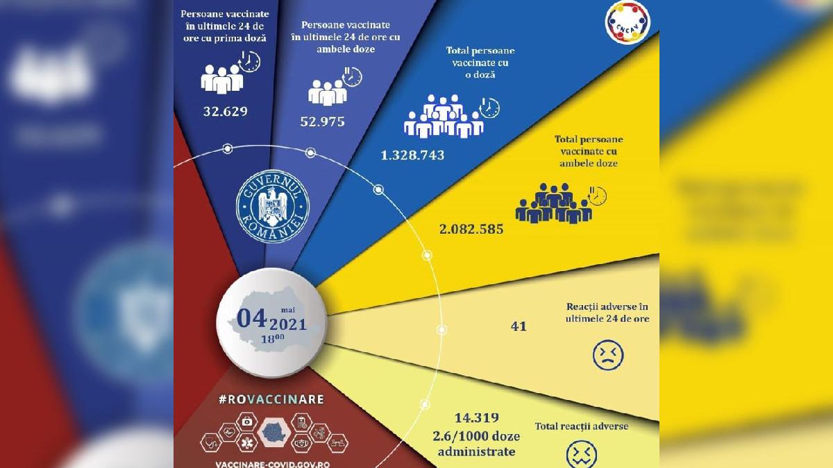 De la începutul campaniei naţionale de vaccinare au fost vaccinate 3.411.328 de persoane, din care 2.082.585 au primit ambele doze de vaccin.