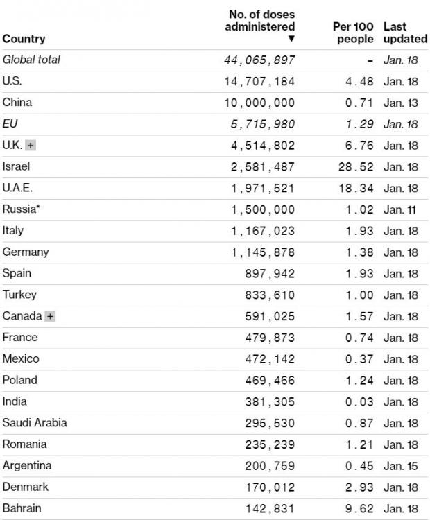 Cele mai multe vaccinări au fost făcute în Statele Unite, care din 14 decembrie și până acum a administrat 14,7 milioane de doze. Uniunea Europeană a depășit 5,7 milioane de inoculări, iar UK - 4,5 milioane.