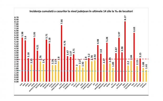 Peste 5 la mie coeficient de infectare la mia de locuitori sunt județele Alba - 5,98, Arad - 5,6, Bihor - 5,95, Brașov - 5,71, Mureș - 5,28, Sălaj - 5,97.