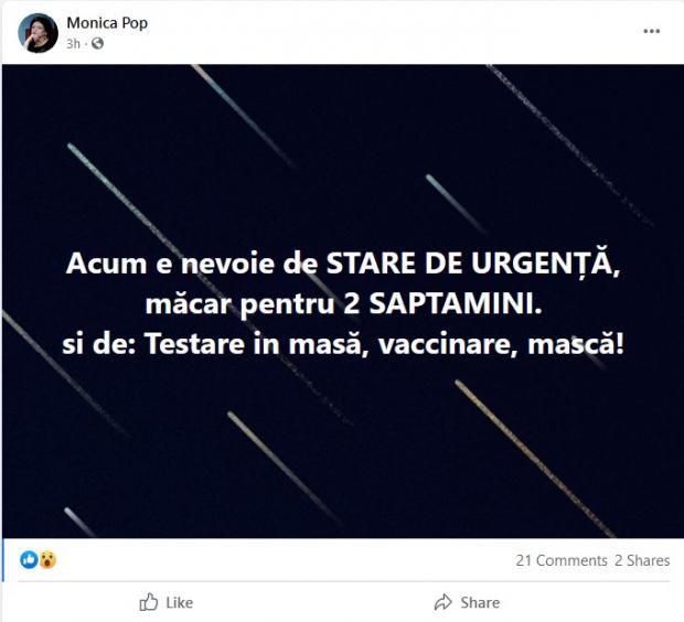 "Acum este nevoie de stare de urgență, măcar pentru două săptămâni și de testare în masă, vaccinare, mască", a scris Monica Pop, pe pagina sa de Facebook.