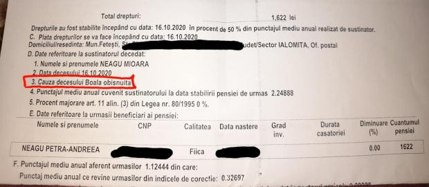 Ceea ce mai vreau sa subliniez este faptul ca ar fi trebuit sa beneficiez de un drept, care in momentul de fata nu imi este recunoscut. Conform Legii nr. 56 din 15 mai 2020 pentru recunoasterea meritelor personalului medical participant la actiuni medicale impotriva COVID-19, Art. 2, alin(1),lit. d) si Art. 4, trebuie sa beneficiez de o pensie de urmas COVID in semn de recunostinta pentru munca depusa de iubita mea mama in spitale. Pensie egala cu 75% din salariul ei de baza, pensie pe care trebuia sa o primesc pentru terminarea studiilor mele. Am incercat sa discut si sa fac acest lucru posibil, insa nepasarea in Romania este caracteristica. Nu mai spun de cuantumul stabilit de Casa de Pensii avand in vedere prima pensie de urmas, cea fireasca, pe care trebuie sa o primesc.