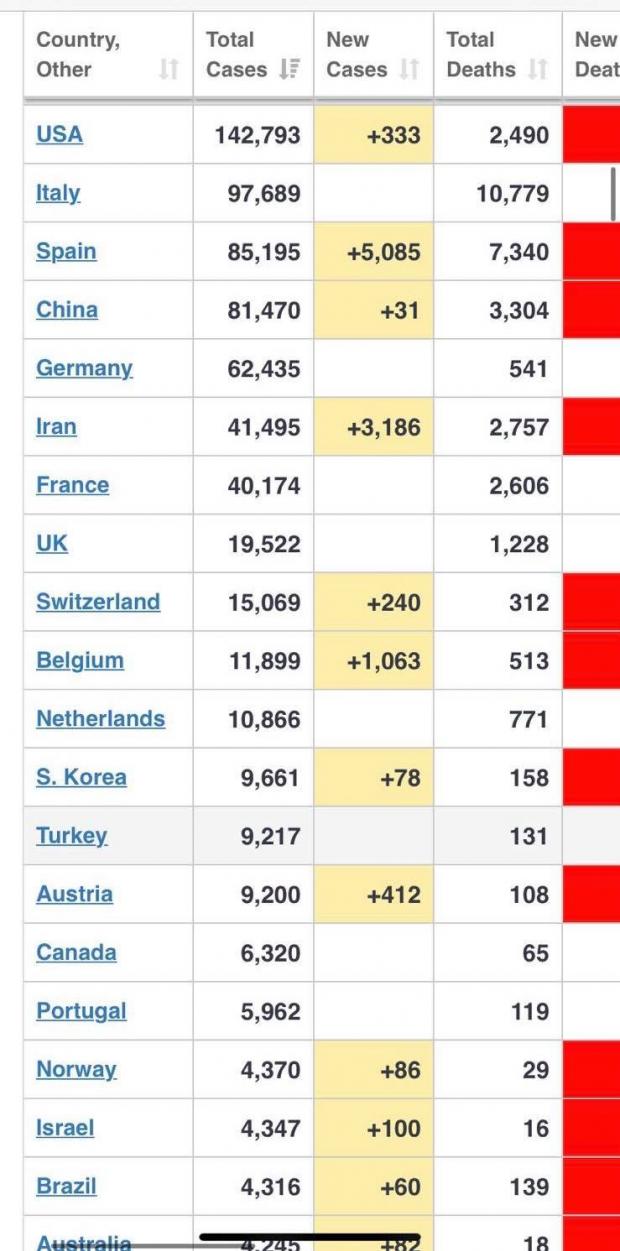 Astfel, Spania ajunge pe locul trei la numărul de cazuri de coronavirus în lume, în top fiind SUA, cu 142,793 de cazuri, și Italia, cu 97,689 de cazuri.