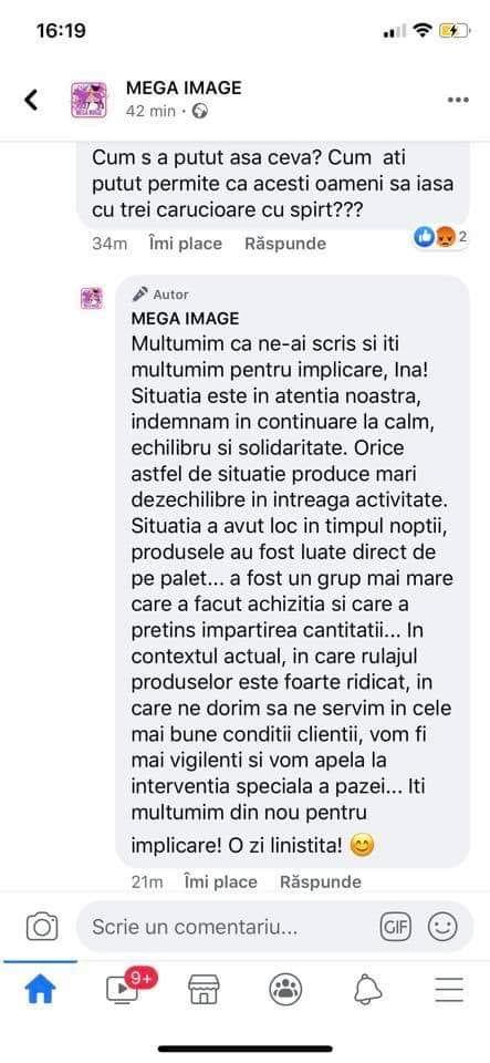 "Imagine (...) de la #MegaImage cu un domn si doamna lui care au cumparat tot spirtul de la raft imediat ce a fost adus de lucratorii comerciali din depozit.