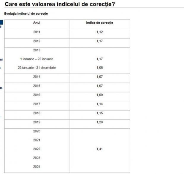 Iată, în tabelul de mai jos, evoluția indicelui de corecție, unde se vede cine a beneficiat de indice de corecție mai mare sau nu a beneficiat deloc.