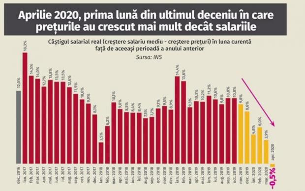 Aprilie 2020 a fost prima lună din ultimul deceniu în care prețurile au crescut mai mult decât salariile.