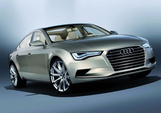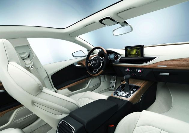 Audi A7 Sportback Concept dispune de linii lungi şi fluide şi un interior reconfortant cu piele albă şi lemn.