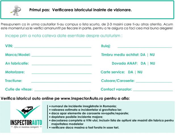 InspectorAuto.ro a lansat un ghid practic destinat cumpărătorilor de maşini rulate, cu ajutorul căruia şoferii pot reduce la minimum şansele de a fi păcăliţi. Acest ghid este disponibil gratuit şi poate fi descărcat de pe site-ul