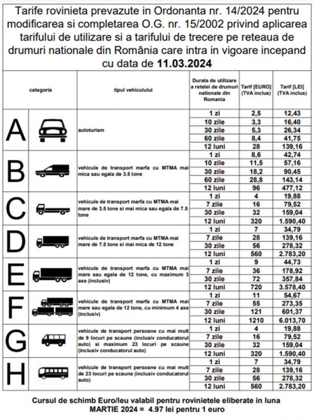 Tarifele actualizate pentru rovinietă au fost publicate de CNAIR, intrând în vigoare începând cu data de 11 martie 2024.