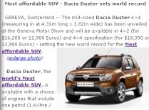?Ca şi celelalte modele Dacia, banii sunt cheia, Duster oferind spaţiu şi echipamente suficiente pentru suma pe care o cere?, notează www.worldrecordsacademy.org. Pe site-ul menţionat se mai precizează că Dacia, o marcă din portofoliul Renault, a înregistrat un adevărat succes în Europa datorită gamei sale de automobile care oferă cel mai bun raport preţ-calitate.