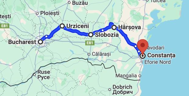- București – A2 – Cernavodă – DN22C – Medgidia – DJ222 – Cuza-Vodă – Mihail Kogălniceanu – DN2A Mihail Kogălniceanu – Ovidiu – Constanţa – Mamaia