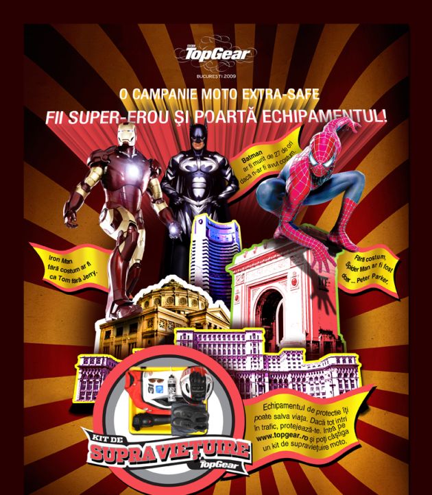Dacă tot intri în trafic, protejează-te! Acesta este mesajul pe care revista Top Gear vrea să-l transmită prin campania: ?Fii super-erou şi poartă echipamentul!? Premisa de la care s-a plecat în derularea acestei campanii a fost aceea că motocicliştii sunt mult mai predispuşi accidentelor rutiere spre deosebire de conducătorii auto, mai ales în haosul existent pe şoselele din România. Pe de altă parte, majoritatea motocicliştilor se expun mergând cu viteză foarte mare, riscând să fie implicaţi în accidente rutiere de o gravitate extremă.