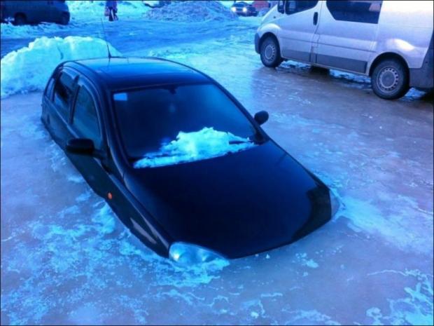 În oraşul Murmansk din Rusia, primăvara a venit cu precipitaţii însemnate, iar ninsorile au făcut ravagii în întreaga zonă. Aşa se face că după o zi călduroasă, în care zăpada s-a topit şi s-a transformat în apă, a urmat o noapte de îngheţ. Iar urmarea este tragi-comică: