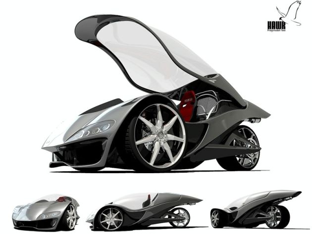 Neozeelandezii nu sunt tocmai cunoscuti pentru vehicule concept, şi totuşi iată că dacă vor să facă ceva în acest sens le reuşeşte. Dovadă stă acest vehicul cu trei roţi care combină structura compactă specifică motocicletelor cu partea practică a unui automobil. Hodge Hawk se adresează nevoilor curente de deplasare ale oamenilor, dar şi celor viitoare. Potrivit worldcarfans.com, Alex Hodge este cel care a realizat designul vehiculului, care este propulsat de un motor Honda RC51 V-twin, de 999cc, prin intermediul căruia poate fi atinsă viteza maximă de 233 km/h. Bineînţeles, materialele uşoare au fost folosite din belşug la acest concept, care este în principal construit din fibră de carbon şi plastic. Vehiculul seamănă cu o maşină dacă este privit din faţă, cu un parbriz panoramic care se prelungeşte până aproape de partea posterioară.