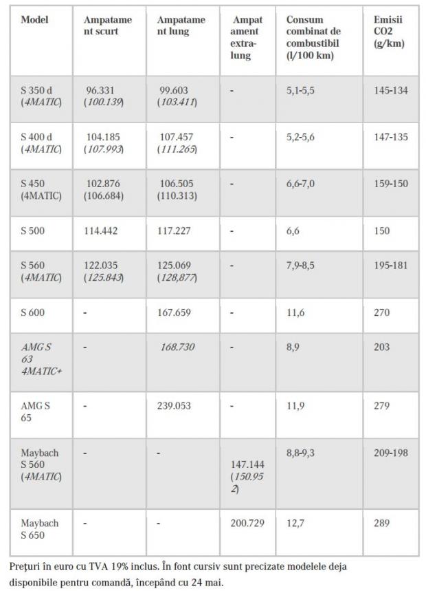 Mercedes-Benz dă startul vânzărilor pentru Noua Clasa S, primele modele - comandate în luna mai - fiind deja în drum către dealerii europeni. Familia Clasei S a crescut la 24 de versiuni. Clienții pot alege între cele nouă motorizări diferite, tracțiune spate sau integrală 4MATIC și ampatament scurt sau lung, dintre modelele Mercedes-Benz, Mercedes-AMG sau Mercedes-Maybach ale noii Clasa S. Cele mai noi modele, disponibile momentan la comandă, vor fi disponibile în showroom-urile partenerilor autorizați din România începând cu luna august.