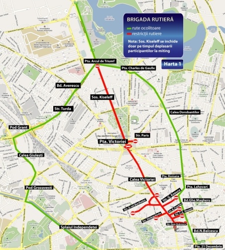 - între orele 12.30 ? 15.00, pe traseul de deplasare al delegaţiei din Calea Victoriei către Ministerul Educaţiei prin Str. George Enescu şi Str. General Berthelot.