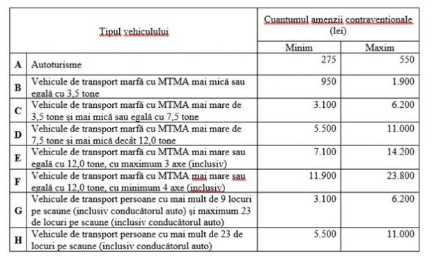 Astfel, valoarea amenzilor contravenţionale s-a calculat ca fiind de două ori tariful anual de utilizare a reţelei de drumuri naţionale din România, pentru amenda minimă şi de patru ori tariful anual de utilizare a reţelei de drumuri naţionale din România, pentru amenda maximă", se arată în expunerea de motive a proiectului.