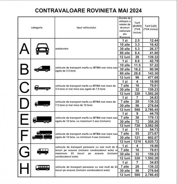 Noile tarife pentru rovinietă au fost publicate de Compania Națională de Drumuri. Din 11 martie 2024, cea mai ieftină rovinietă costă 2,5 euro, este pentru autoturisme și are o valabilitate de 24 de ore.