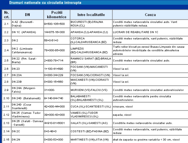- jud. Prahova pe DN1 km 67-74 (Blejoi), jud. Arges pe DN73 km 57-92 (Podu Dambovitei), pe DN73 km 84-112 (Calinesti) pe DN73D km 0-49 (Pitesti), jud. Buzau (zona de munte)- drumuri cu zapada 1-2 cm + material antiderapanat: