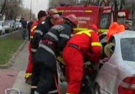 Pompierii sosiţi la faţa locului s-au chinuit mai bine de jumătate de oră să-l scoată pe şofer. A rămas prins în scaunul maşinii de lux pe care o conducea.