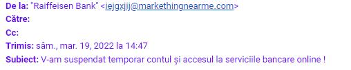 Cei care au primit acest mesaj au semnalat că au fost țintele unei înșelătorii. Semnele prin care ne dăm seama de aceste tentative de fraudă este, în principal, adresa de la care este trimis mesajul respectiv în numele băncii, aşa cum reiese din exemplul de mai jos.