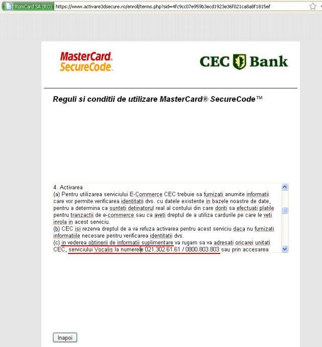 Regulile si conditiile de utilizare MasterCardŽ SecureCode? sunt identice pentru toate bancile care opereaza acest serviciu prin RomCard S.A., exceptie facand detaliile de contact. Aceste reguli sunt sub controlul Romcard S.A, procesatorul 3 D Secure/Visa Secure Code. Disfunctionalitatea sesizata a fost cauzata de o eroare umana, in data de 18.02.2010, urmare a implementarii unei noi aplicatii informatice de catre Romcard S.A.