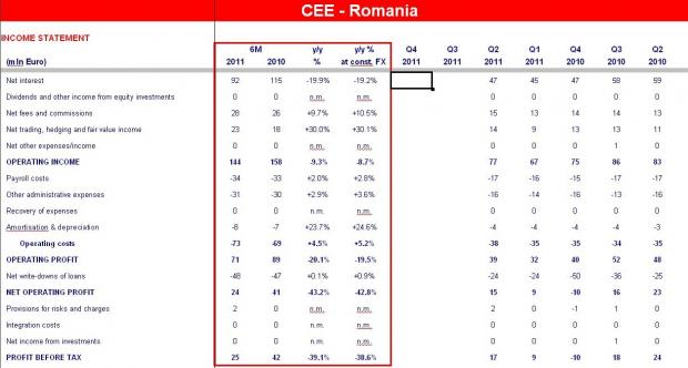 Veniturile nete din dobanzi au scazut de la 115 mil. Euro la 30 iunie 2010 pana la 92 mil. Euro, ceea ce inseamna un minus de 20%, in timp ce veniturile nete din taxe si comisioane s-au majorat in perioada de referinta cu 9,7% pana la 28 mil. Euro.