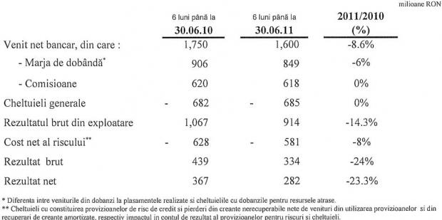 Venitul net bancar a scazut de la 1,75 mld. Lei pana la 1,6 mld. Lei (377 mil. Euro), pe fondul unei scaderi de 6% a incasarilor din marja de dobanda si o relative stagnare a veniturilor din comisioane. Profitul brut din exploatare a coborat si el cu 14% pana la 914 mil. Lei (215 mil. Euro), cifre corelate cu actuala conjunctura economica, dupa cum afirma reprezentantii bancii. In acelasi timp, banca si-a controlat costurile pentru a-si conserva profitabilitatea, BRD anuntand un nivel al cheltuielilor generale constant fata de aceeasi perioada de referinta din 2010, coeficientul de exploatare ajungand la 42,8% la 30 iunie 2011.