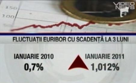 După două zile bune pentru moneda naţionala, miercuri, leul a scazut din nou în faţa monedei europene. Cursul BNR a fost stabilit la 4,26 de lei pentru un euro, cu 17 bani mai mult decât marţi. Cum spuneai şi tu, aceasta nu este singura veste proastă pentru românii care au credite în euro. Dobânzile de pe piaţa interbancară europeană, mai cunoscutul Euribor, nu se mai opresc din creştere. Dacă la începutul anului trecut Euribor era de 0,7% , miercuri a fost de 1,01%. Asta înseamnă că cel care plătea anul trecut o rată lunară de 400 de euro, anul acesta va plăti cu 12 euro mai mult.