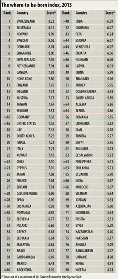 În clasamentul întocmit pe baza a 11 indicatori, România ocupă locul 56 după state precum Cuba sau Arabia Saudită.