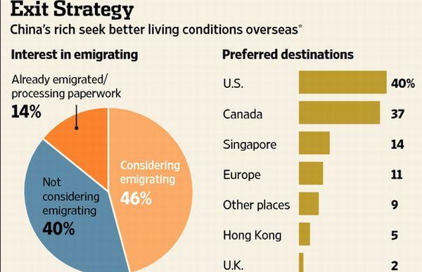 Cea mai populară destinaţie de emigrare este America. Sondajul, publicat sâmbătă de Bank of China şi grupul de cercetare Hurun Report, a fost realizat pe un eşantion de 980 de chinezi cu averi de peste 10 milioane de yuani (1,6 milioane de dolari).