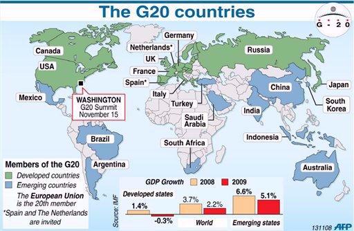 Toate ţările industrializate membre ale G7, adică SUA, Germania, Franţa, Canada, Italia, Marea Britanie şi Japonia. La acestea se adaugă 12 state emergente: Africa de Sud, Arabia Saudită, Argentina, Australia, Brazilia, China, Coreea de Sud, India, Indonezia, Mexic, Rusia şi Turcia.