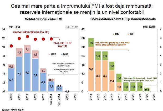 Inaintea de aceste plati de mari dimensiuni, datoria publica a Romaniei se plasa la 39,5% din PIB. Acesta s-a triplat dupa contractarea creditelor pe care le returneaza acum BNR si nu s-a mai situat sub 30% din PIB dupa 2010, chiar daca banca centrala a rambursat rate semnificative de imprumut, care au depasit 7 miliarde de euro anual in 2011 si 2012.Insa in paralel cu ratele platite de Banca Nationala, Ministerul Finantelor Publice (MFP) a contractat credite de pe piata internationala de capital, la valori similare cu sumele platite de autoritatea monetara. Cu alte cuvinte, statul roman si-a refinantat datoria catre FMI prin intermediul pietei internationale de capital, imprumutandu-se la termene de plata mai lungi. Iar BNR si MFP functioneaza ca doua vase comunicante, in contextul in care contul Trezoreriei Statului e deschis la banca centrala. Si pentru ca s-a discutat mult , intr-o anumita vreme, de buffer-ul de lichiditate al Finantelor, merita mentionat ca aceasta rezerva-tampon, pe care a constituit-o MFP la sugestia FMI, pe seama imprumuturilor in valuta realizate de pe piata externa, are rolul de a echilibra rezerva valutara.